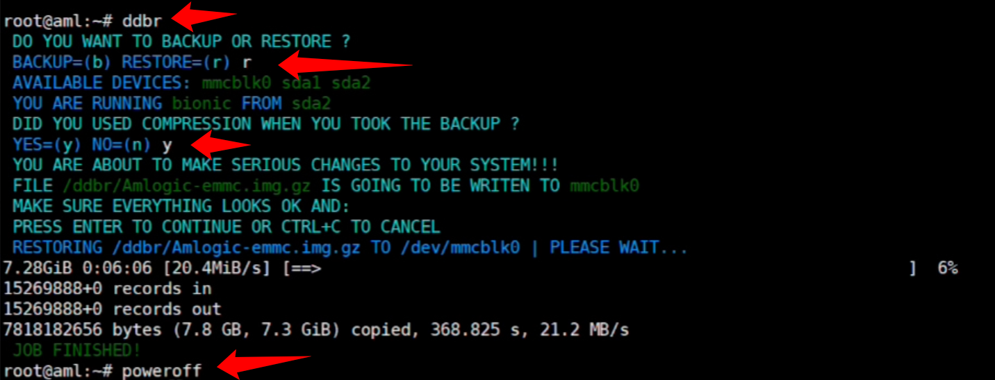 6、回到ssh连接,执行ddbr,选择restore。完成后关机。