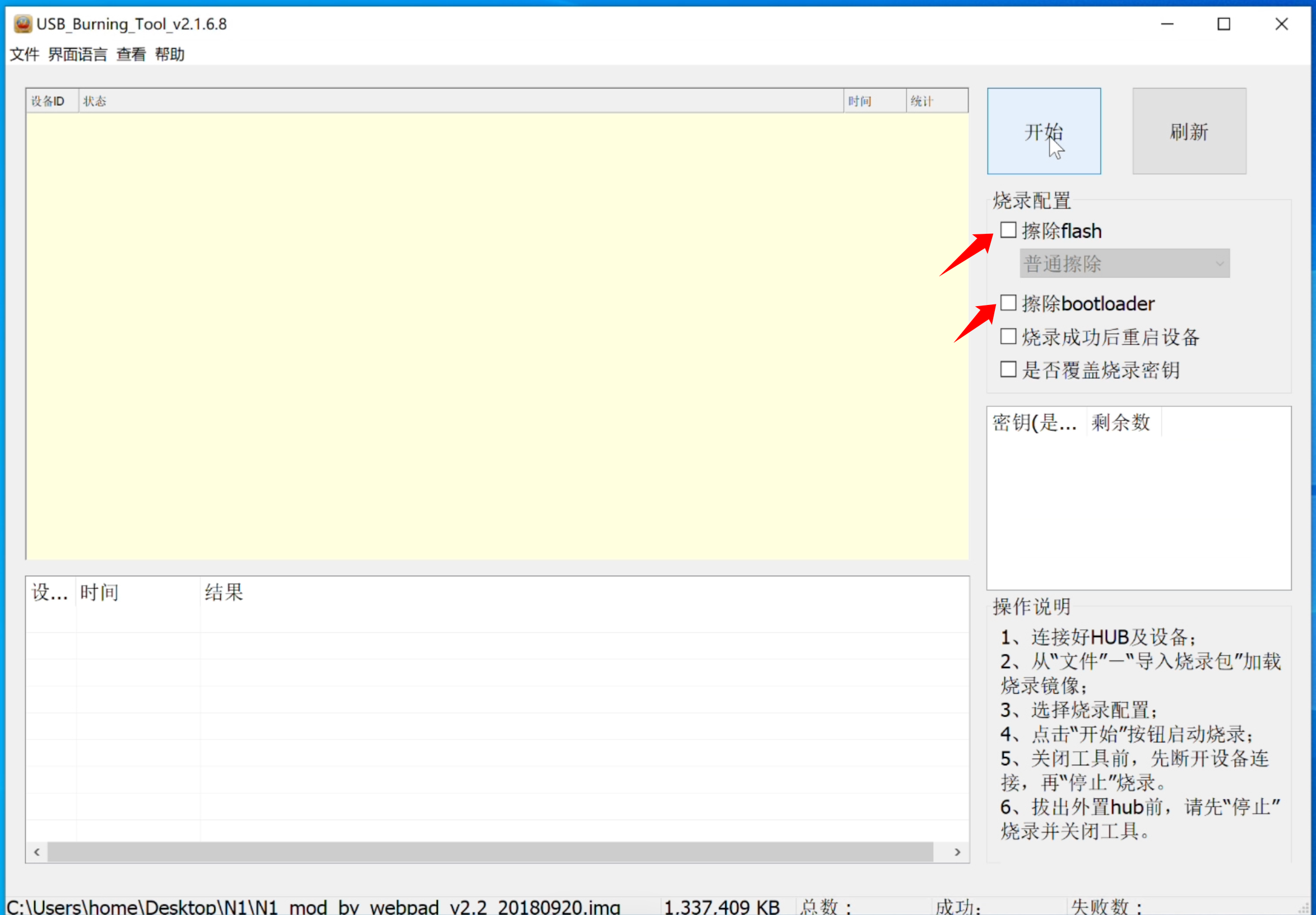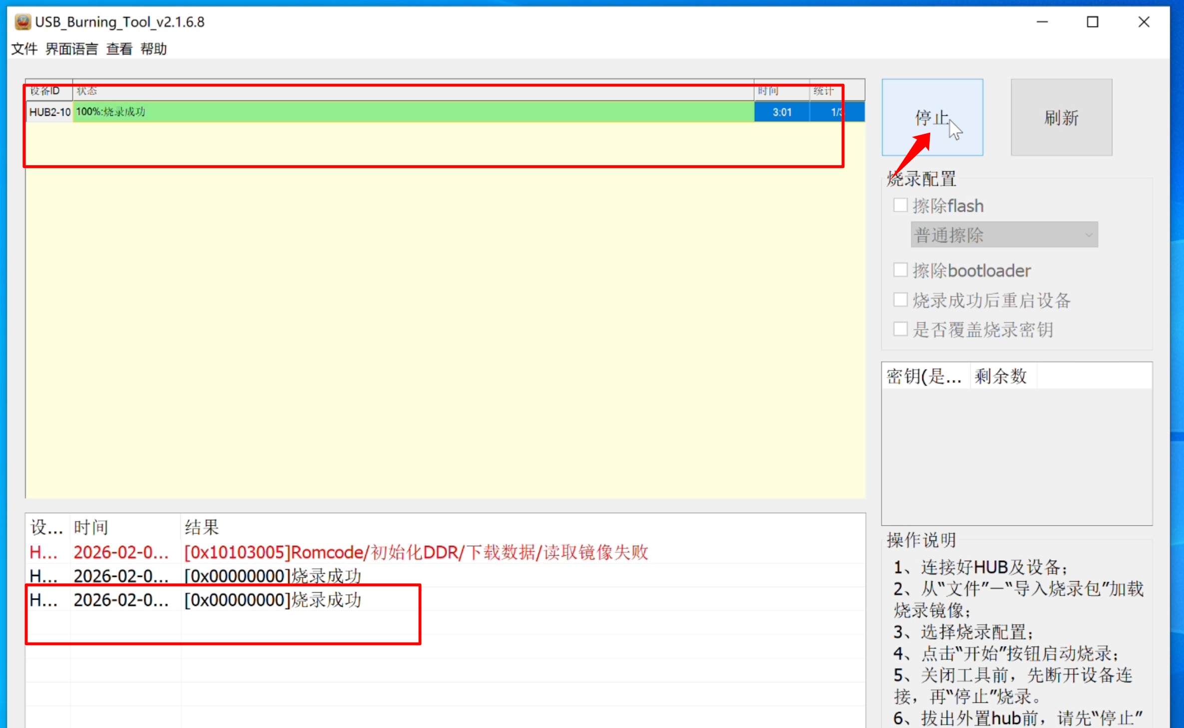8、自动开始烧录,成功后点击停止,重现上电启动,救恢复到N1原系统了。