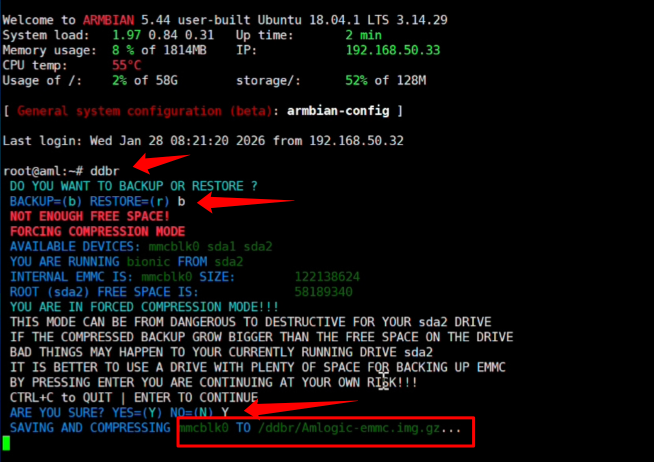 4、root帐户执行命令ddbr,选择backup,查看emmc文件存储位置。