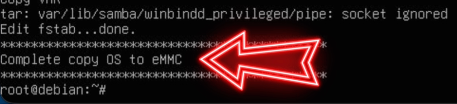 4、当界面出现以下提示时:**Complete copy OS to eMMC,**断开电源,拔掉U盘再通电启动,就完成刷机。
