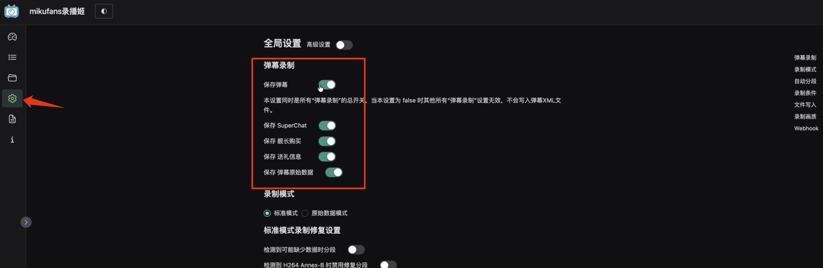 在设置里,有更多的高级设置,比如录制直播中的弹幕、礼物信息等,以及录制格式,都可以按照需求开启。