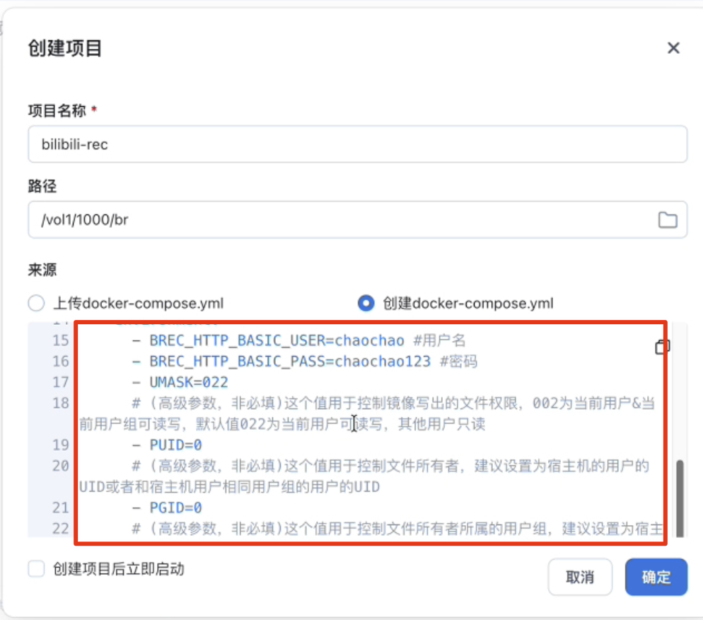 # (高级参数,非必填)这个值用于控制文件所有者所属的用户组,建议设置为宿主机的用户相同的用户组的GID其中的 source: /vol1/1000/br # 在这里写宿主机保存录播的路径,可以修改为你想保存的录制文件地址。